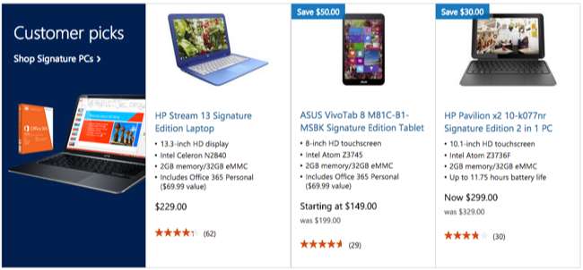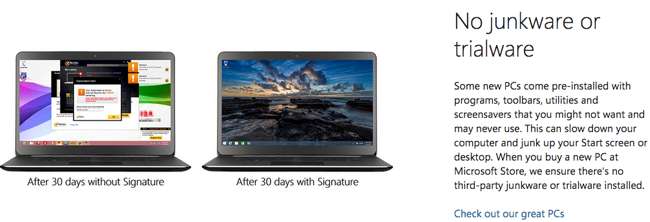 Ma Microsoft si preoccupa dei "PC Signature" che puoi acquistare da Microsoft Store. Quando acquisti un computer da Microsoft Store, uno dei negozi fisici di Microsoft o il sito Web di Microsoft Store online, hai la garanzia di ottenere una "Signature Edition" di quel computer . Microsoft controlla il software fornito su questi PC e rimuove le cose peggiori per assicurarsi di avere una copia pulita di Windows con solo utilità e driver utili.