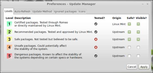 Per controllare questa impostazione, apri l'applicazione Update Manager dal menu del tuo ambiente desktop. Fare clic sul menu Modifica e selezionare Preferenze. Sarai quindi in grado di scegliere i "livelli" dei pacchetti che desideri installare. I "livelli" sono definiti nel file delle regole di aggiornamento di Mint menzionato in precedenza. I livelli 1-3 sono abilitati per impostazione predefinita, mentre i livelli 4-5 sono disabilitati per impostazione predefinita. Firefox è un pacchetto di livello 2, aggiornato per impostazione predefinita. X.org e il kernel Linux sono rispettivamente di livello 4 e 5, quindi non vengono aggiornati per impostazione predefinita.
