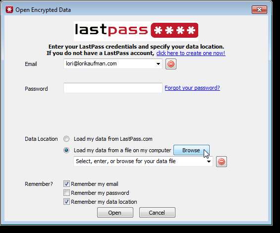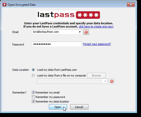 Viene visualizzata la finestra di dialogo Apri dati crittografati. Inserisci la tua email e password per la tua cassaforte LastPass. Per Posizione dati, seleziona Carica i miei dati da LastPass.com. Utilizzare le caselle di controllo accanto a Ricordare? per fare in modo che LastPass pocket ricordi le informazioni inserite in questa finestra di dialogo, se lo si desidera. Non è consigliabile che LastPass Pocket ricordi la tua password. Se devi inserirlo ogni volta, è più sicuro. Fare clic su Apri.
