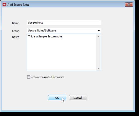 Viene visualizzata la finestra di dialogo Aggiungi nota protetta. Immettere un nome per la nota e selezionare un gruppo dall'elenco a discesa. Immettere le informazioni private che si desidera memorizzare per questa nota nella casella Note. Se vuoi inserire nuovamente la tua password per accedere a questa nota in LastPass Pocket, seleziona la casella di controllo Richiedi Reprompt Password. Fare clic su OK.