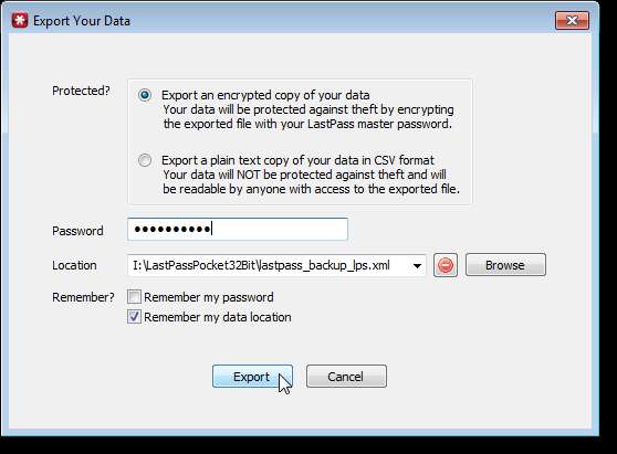 Di nuovo, seleziona se desideri che LastPass Pocket ricordi la tua password e la posizione dei dati utilizzando le caselle di controllo accanto a Ricorda. Ancora una volta, sconsigliamo che LastPass Pocket ricordi la tua password. Fare clic su Esporta per creare il file crittografato.