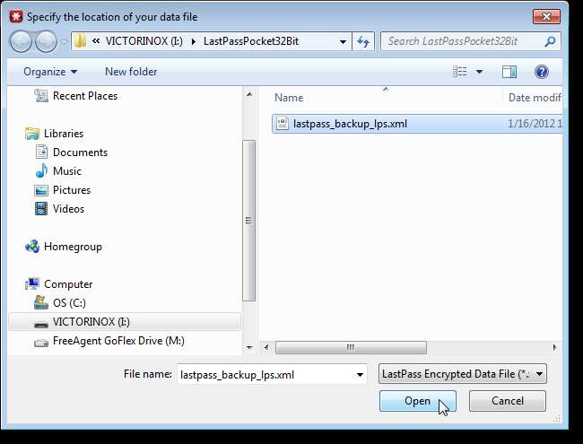 Il percorso del file crittografato viene visualizzato nella casella di modifica. Fai clic su Apri per importare nuovamente i dati in LastPass Pocket.
