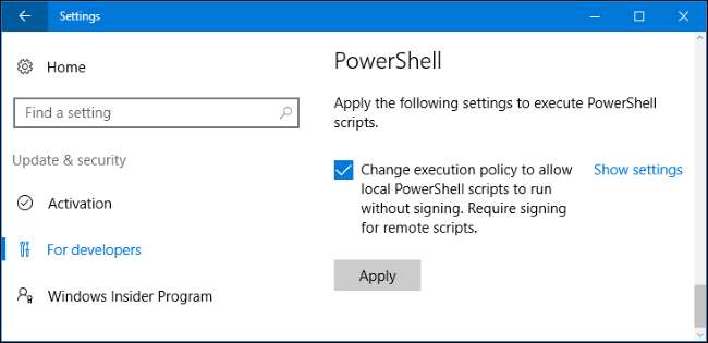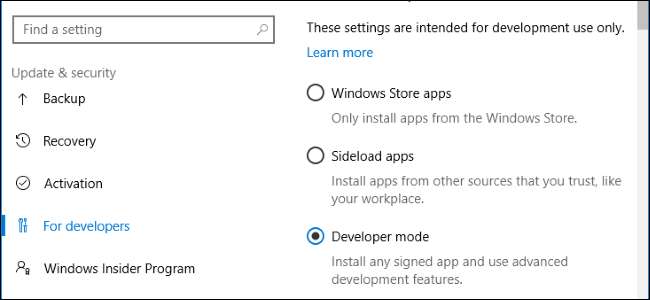 Questa impostazione è disponibile nell'app Impostazioni. Per accedervi, vai su Impostazioni> Aggiornamento e sicurezza> Per sviluppatori e seleziona "Modalità sviluppatore".