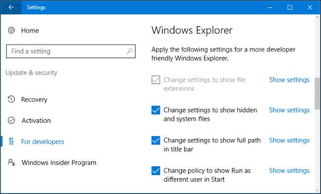 La modifica del collegamento simbolico è un buon esempio di ciò che Microsoft continuerà a fare con la modalità sviluppatore in futuro. La modalità sviluppatore è un interruttore che capovolgi per dire a Windows che sei uno sviluppatore e Windows può regolare automaticamente una varietà di impostazioni per far funzionare meglio Windows per te.