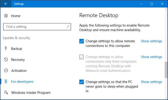 Per Desktop remoto , La Modalità sviluppatore può modificare varie impostazioni per garantire che il PC sia sempre accessibile alle connessioni Desktop remoto. Può modificare le impostazioni di Windows Firewall per consentire connessioni desktop remoto al computer e consentire connessioni solo da computer che eseguono Desktop remoto con autenticazione a livello di rete.