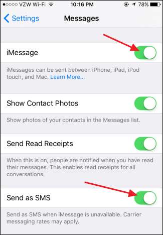 Ci sono due pulsanti rilevanti nella schermata Messaggi, entrambi attivati per impostazione predefinita sui nuovi dispositivi. Usa "iMessage" per attivare e disattivare iMessaging. Utilizza l'interruttore "Invia come SMS" per specificare se l'app Messaggi deve inviare automaticamente messaggi tramite SMS quando iMessage non è disponibile.