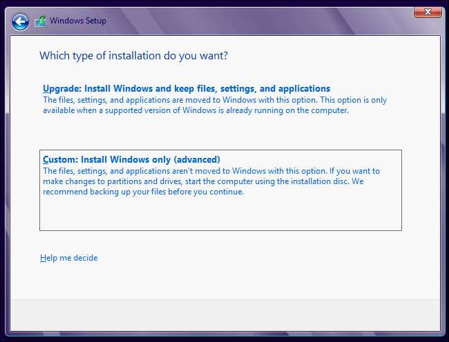 Per eseguire un'installazione pulita di Windows, non selezionare l'opzione Aggiorna durante l'installazione di Windows. Seleziona il Personalizzato: installa solo Windows (avanzato) opzione e seleziona il disco rigido su cui desideri installare Windows. Puoi persino eseguire un'installazione pulita con una licenza di aggiornamento. La licenza di aggiornamento richiede solo che il tuo computer abbia già una licenza valida per una versione precedente di Windows; non richiede l'esecuzione di un'installazione di aggiornamento.