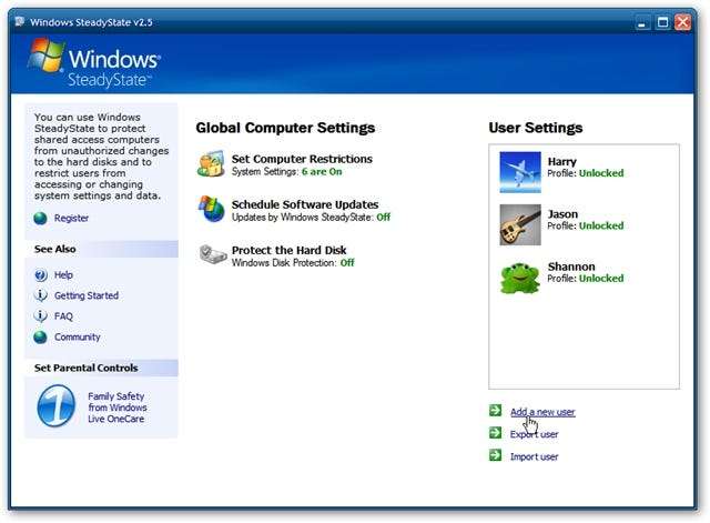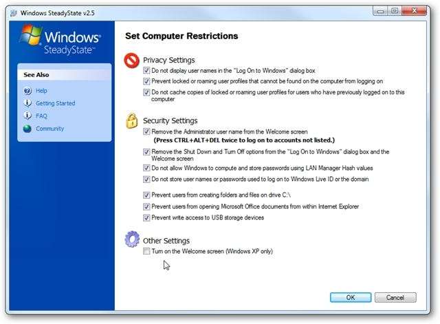 SteadyState non solo riporta il PC al suo stato originale, ma è possibile configurarlo per limitare ciò a cui l'utente può accedere. Puoi bloccare praticamente ogni aspetto del computer, dai programmi ai siti Web e altro ancora. Ovviamente dovrai essere l'amministratore e la prima cosa da fare è installare i driver correnti e gli aggiornamenti di Windows. Quindi installa i programmi e configura le impostazioni che desideri su come desideri che sia la macchina ogni volta che viene ripristinata. Una volta che tutto è impostato e hai creato un account utente diverso, puoi lasciare che il pubblico lo abbia. Qualsiasi modifica apportata alla configurazione verrà annullata semplicemente riavviando la macchina. Qui diamo uno sguardo a SteadyState in esecuzione su una macchina Windows XP.