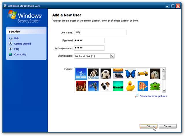 Nella prima parte della procedura guidata SteadyState, aggiungi il nome utente, la password e l'immagine. Si noti che è possibile creare l'utente sull'unità di sistema o su una partizione o unità alternativa.