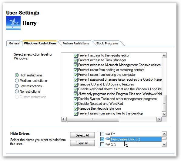In Restrizioni di Windows puoi limitarli da diversi aspetti del sistema operativo. Puoi impostare le restrizioni da Alta, Media, Bassa, nessuna o personalizzarle in base alle tue esigenze. Puoi anche nascondere alcune unità all'utente, in modo che non possano scherzare con i dati su di esse.