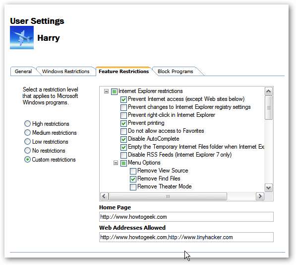 In Feature Restrictions è possibile bloccare l'accesso a Internet tramite Internet Explorer e menu e impostazioni del programma. La caratteristica interessante qui è che puoi impostare la home page dell'utente e anche creare una lista bianca di siti a cui avranno accesso.