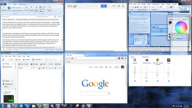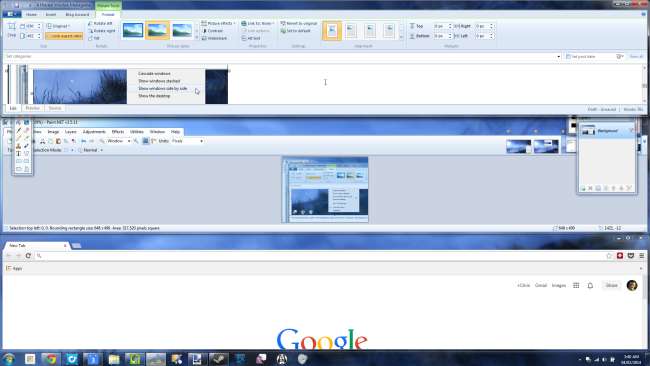 [ウィンドウを並べて表示]オプションは、開いているウィンドウを自動的に並べて配置できるため、さらに興味深いものです。 Aeroスナップに似ていますが、3つ以上のウィンドウを自動的に配置して並べて配置できるため、大画面のワイドスクリーンモニターでのマルチタスクに役立ちます。