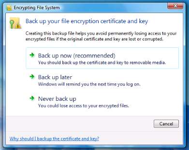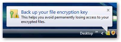 暗号化機能を使用する場合は、暗号化キーのバックアップを作成することが非常に重要です。ありがたいことに、Vistaは、ファイルを最初に暗号化した直後に通知します。