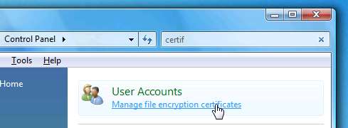 注:[バックアップしない]を選択した場合、またはポップアップ通知が表示されない場合でも、恐れることはありません。暗号化キーをバックアップできます。コントロールパネルを開いて、「証明書」(または以下に示すように最初の数文字)を入力するだけです。