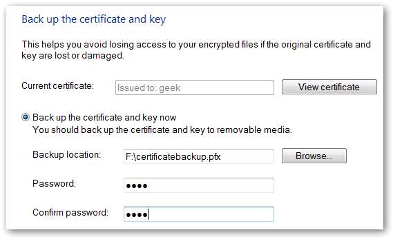暗号化キーを1つのステップで簡単にバックアップできる非常にシンプルな画面が表示されます。正直なところ、このルートは他のウィザードを使用するよりも高速だと思います。同じことを実現するために2つの異なる画面を作成したのはバグです。