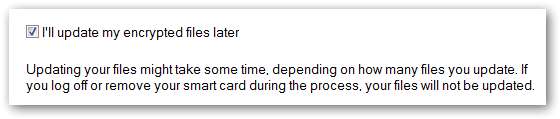 この時点では実際には証明書を変更せず、バックアップするだけなので、[暗号化されたファイルは後で更新します]のチェックボックスをオンにします。