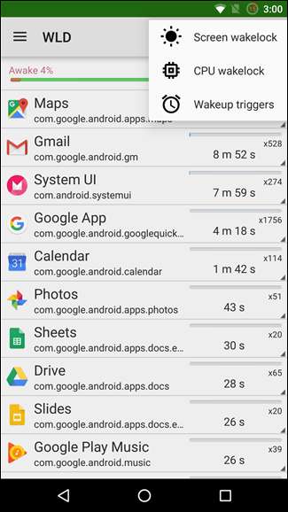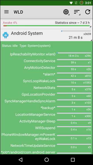 基本的に、詳細モードでは、WLDは、インストールしたアプリと一緒にシステムプロセスを表示できます。電話機をスリープ状態にしないことがわかっているすべてのコンポーネントを必ずしもアンインストールできるわけではありませんが、Wakelock Detectorは、ROMの問題を強調表示し、別のコンポーネントを試すか、ROMの特定の機能を無効にするかを決定するのに役立ちます。 。