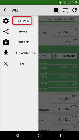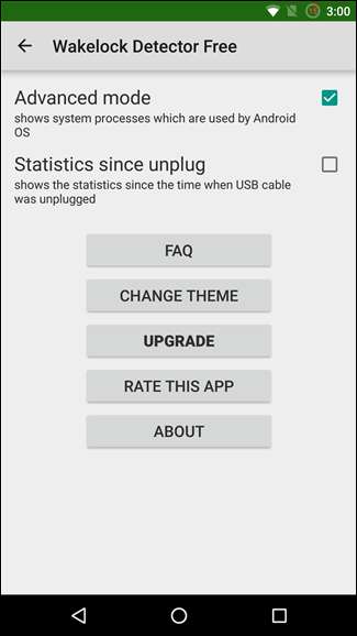 さまざまなROMを試してみたい場合は、WakelockDetectorを使用してさまざまなシステムコンポーネントのバッテリー使用量を追跡することもできます。左上隅にある3つのダッシュをタップしてメニューを開き、[設定]をクリックして、[詳細モード]オプションを有効にします。