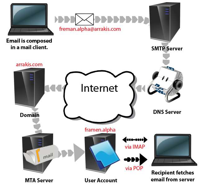 誰か、たとえばスパイスの売り手がメールを送信するときは、user @ domain.extの形式のアドレスが必要です。この例には[email protected]があります。電子メールは、クライアントからSimple Mail TransferProtocolを介して送信メールサーバーに送信されます。 SMTPサーバーは、郵便料金と住所をチェックし、メールの送信先を特定するローカル郵便局のようなものです。ただし、ドメインは理解していません。これらは一種の抽象的なものであるため、SMTPサーバーはドメインネームシステムサーバーに接続します。 DNSサーバーは、インターネット用の一種の電話またはアドレス帳です。 「arrakis.com」のようなドメインを「74.238.23.45」のようなIPアドレスに変換します。次に、そのドメインに「MX」サーバーまたはメール交換サーバーがあるかどうかを確認し、メモします。これは、郵便局が郵便物の行き先の地図を調べ、地元の郵便局に電話をかけ、友人が郵便受けや郵便受けを持っているかどうかを確認するようなものです。メールを受信するボックス。