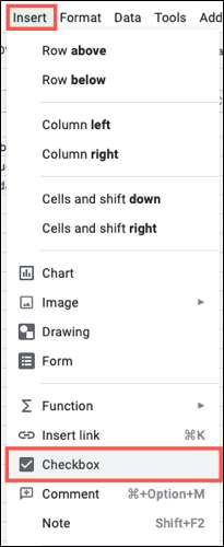 訪問 グーグルシート 、サインインして、使用したいシートを開きます。チェックボックスが必要なセルを選択します。次に挿入&gtをクリックします。メニューからチェックボックス。