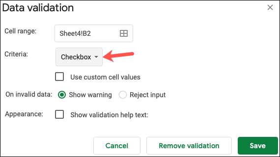 後で割り当てたカスタム値がなくなったことを選択した場合は、それらを削除することが簡単です。チェックボックスを含むセルを右クリックし、値を追加したときに「データ検証」を選択します。
