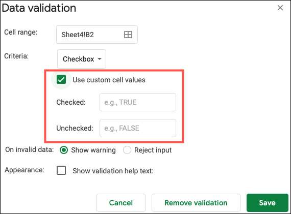 カスタムセル値を使用するには、ボックスをオフにして、「保存」をクリックします。これにより、チェックボックスを維持することができますが、割り当てられた値を削除するだけです。