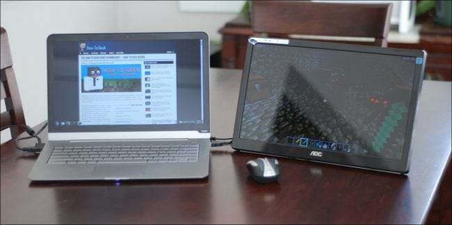 上で概説したセットアップの明らかな主な欠点(新しいケーブルまたはアダプターをシェルアウトする必要があるかどうかに関係なく)は、移植性の問題です。素敵なデスクトップモニターをラップトップに追加すると、通常、画面のスペースが2倍(または3倍)になりますが、自宅やオフィスの机に座っている場合に限ります。スリムなデスクトップモニターでさえも梱包して、ビジネスや図書館に持ち出すのはかなり非現実的です。