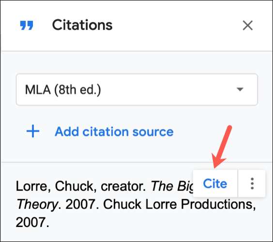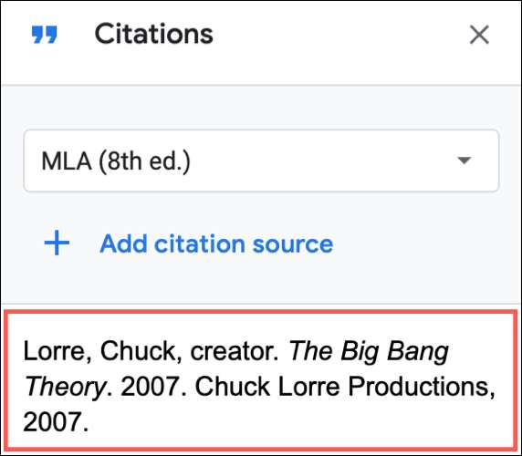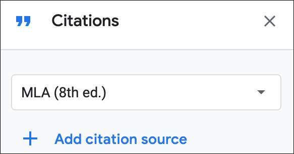 これにより、引用が1つ以上の引用を追加するための引用サイドバーが開きます。その上部に、ドロップダウンリストから使用するフォーマットを選択します。あなたはMLA、APA、またはシカゴを選ぶことができます。次に、「引用元の追加」をクリックします。