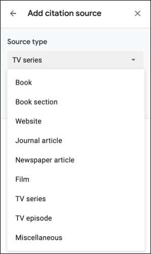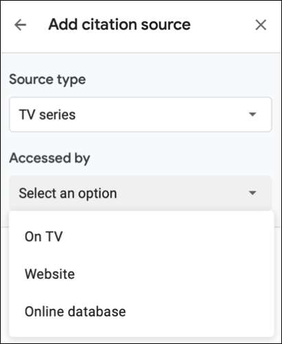 ドロップダウンからアクセスされた状態で、ソースのオプションを選択します。これらは選択したソースタイプによって異なります。たとえば、本を選択した場合は、印刷を選択できます。テレビのエピソードを選択した場合は、テレビで選択できます。
