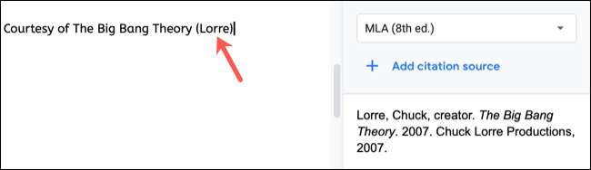 Google Docs Citationsツールの1つの大きな機能は、あなたがあなたのテキストの直接のソースの引用を挿入できることです。 CITATIONSのサイドバーが開いていることを確認し、自分の文書の引用を希望する場所にカーソルを置きます。