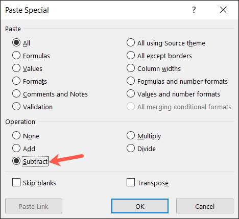 ペーストを貼り付けるセルを選択して、特別な貼り付けを開きます。 「減算」を選択して「OK」をクリックしてください。
