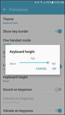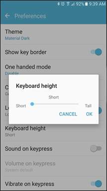スライダーを使用して選択する5つの異なる高さオプションがあります:Short、Mid-short、Normal、Mid-tall、およびTall。コンテンツを増やしてキーボードを減らすのが好きなので、「小」に設定しておきます。ただし、画面が小さいデバイスを使用している場合は、 小さい。先に進んで、このオプションを少し試して、自分に最適なものを確認してください。