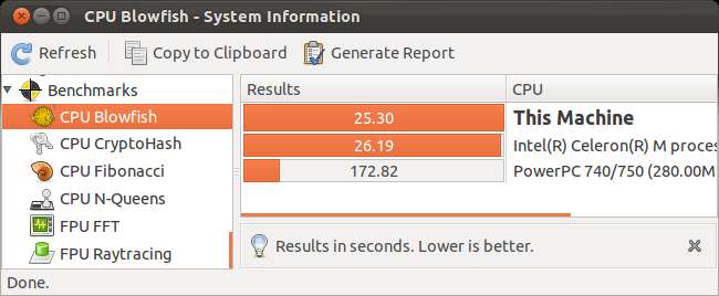 リストの一番下までスクロールし、6つのCPUベンチマークの1つを選択して、CPUのベンチマークを行います。 Hardinfoは、CPUのパフォーマンスを他のCPUと比較します。 CPUベンチマークは、コンピューター間のCPU速度を比較したり、オーバークロックの影響を判断したりする場合に役立ちます。
