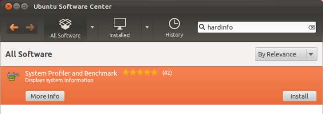 HardinfoはデフォルトではUbuntuにインストールされていませんが、Ubuntuソフトウェアセンターで入手できます。「hardinfo」を検索して、システムプロファイラーとベンチマークアプリケーションをインストールするだけです。別のLinuxディストリビューションを使用している場合は、パッケージマネージャーで「hardinfo」パッケージを検索してください。