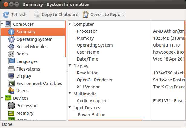 Hardinfoは、システム、そのハードウェア、およびその構成に関する情報を表示します。レポートの生成機能を使用すると、レポートを保存して、ベンチマークを含む、含める情報を選択できます。