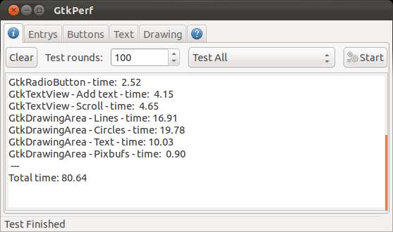 ベンチマークを開始すると、GtkPerfはGTK +ウィジェット操作を実行し、完了するまでにかかる時間を測定します。