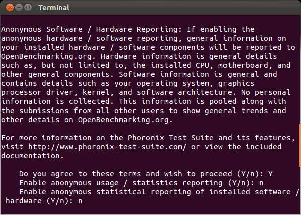 Phoronix Test Suiteの利用規約では、テスト結果を送信することを選択した場合、テスト結果は公開され、匿名レポート機能を有効にすると、PTSは匿名データをアップロードします。Yを入力して同意します。その後、匿名レポート機能を有効にするかどうかを選択できます。