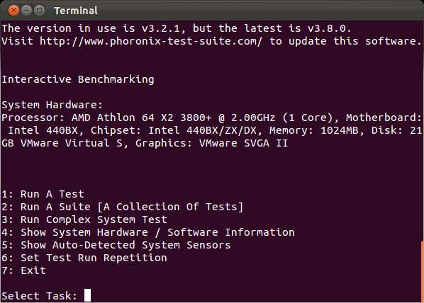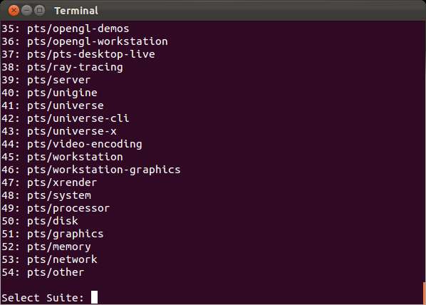 Phoronix Test Suitは、ベンチマークのメニューと選択可能な情報オプションを提供します。