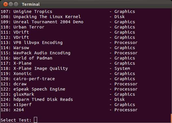 単一のテストを実行するには、1と入力します。選択できる126のテストのリストが表示されます。テストに追加のソフトウェアが必要な場合、テストスイートは自動的にそれをダウンロードします。