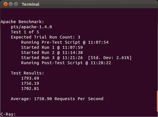複雑なシステムテストを実行するには、3と入力します。複雑なシステムテストには、Webページ配信パフォーマンス用のApacheベンチマーク、レイトレーシングパフォーマンス用のC-Ray、メモリパフォーマンス用のRAMspeed(2つの異なる構成)、およびディスクトランザクション用のPostMarkの5つのテストが含まれます。パフォーマンス。