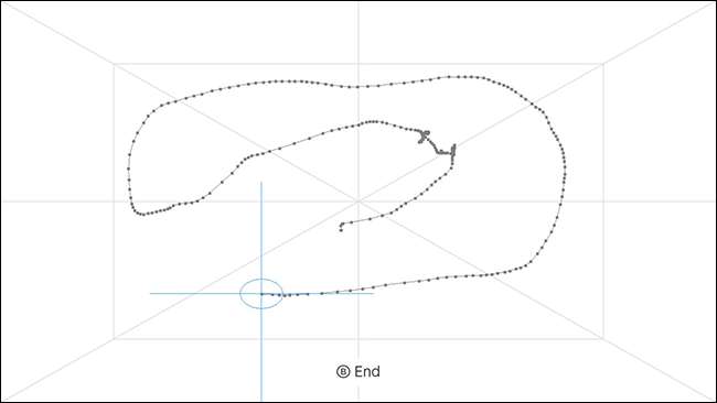 この画面には、十字線が入った円が表示されます。操縦桿に触れていないときは、緑色のプラス記号が表示されます。操縦桿を動かすと、緑色の点が表示されます。コントローラの半径の端に達すると、円が緑色に変わります。コントローラーの動きのいずれかが正しく機能しない場合は、コントローラーのXを押して調整します。