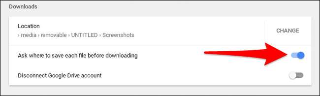 [ダウンロードする前に各ファイルを保存する場所を尋ねる]オプションがオンになっていない限り、Chromeがデフォルトですべてのダウンロードを保存する場所であることにも注意してください。もちろん、このオプションを有効にすると、各ファイルを好きな場所に保存できます。