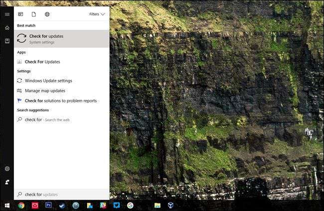 Windowsボタンまたは検索ボタンを押して、ボックスに「アップデートを確認」と入力します。次に、Enterキーを押すか、最初の結果をクリックします。これにより、Windows 10設定アプリケーション(または、Windows 7を使用している場合はコントロールパネル)の専用のWindowsUpdateページに移動します。