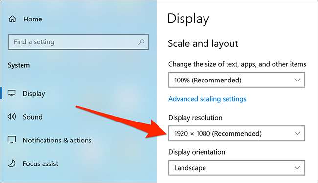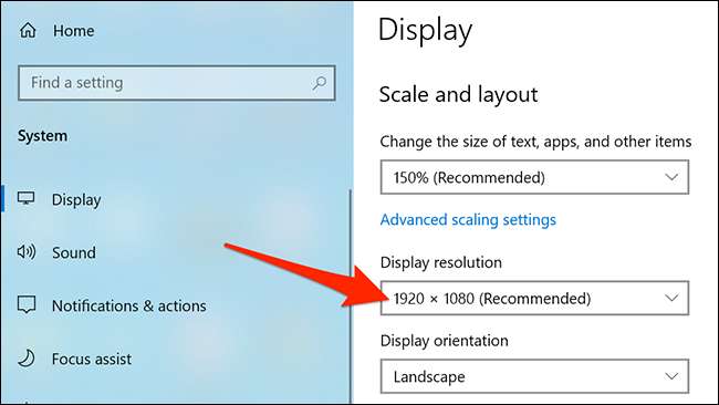 右側のペインで、「スケールとレイアウト」のセクションまでスクロールします。ここでは、「表示解像度」ドロップダウンメニューに表示されている値は、現在の画面解像度です。