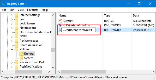 キーを押して、[新規]> [DWORD(32ビット)値]を選択します。新しい値に「ClearRecentDocsOnExit」という名前を付けます。