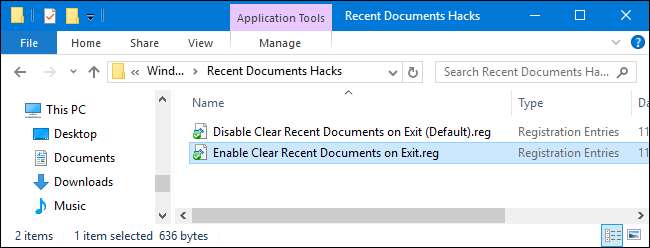 自分でレジストリに飛び込みたくない場合は、ダウンロード可能な2つのレジストリハックを作成しました。 1つのハックはWindowを終了するときに最近のドキュメントのクリアを有効にし、もう1つのハックはそれを無効にしてデフォルト設定に戻します。どちらも次のZIPファイルに含まれています。使用するものをダブルクリックし、プロンプトをクリックしてから、コンピューターを再起動します。