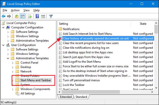 ローカルグループポリシーエディターの左側のウィンドウで、[ユーザーの構成]> [管理用テンプレート]> [スタートメニューとタスクバー]にドリルダウンします。右側で、[終了時に最近開いたドキュメントの履歴をクリアする]設定を見つけてダブルクリックします。