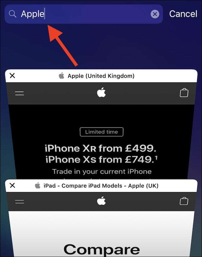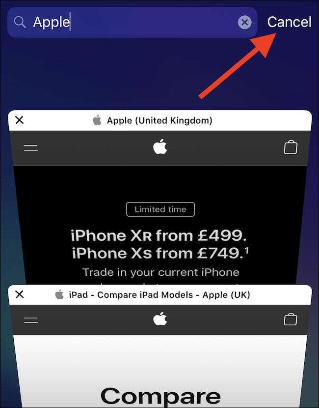タブを選択したら、「キャンセル」を押し続けます。入力した検索に一致するタブを閉じるオプションが表示されます。タップします。