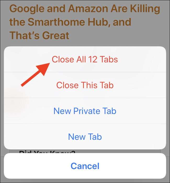 「すべてのxタブを閉じる」というラベルの付いたオプションを含むオプションのリストが表示されます。「x」は開いているタブの数です。すべてのタブを閉じるには、ボタンをタップします。