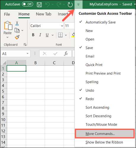 フォームボタンをクイックアクセスツールバーに追加するには、ツールバーの矢印をクリックしてクイックアクセスツールバーメニューをカスタマイズします。 「その他のコマンド」を選択してください。